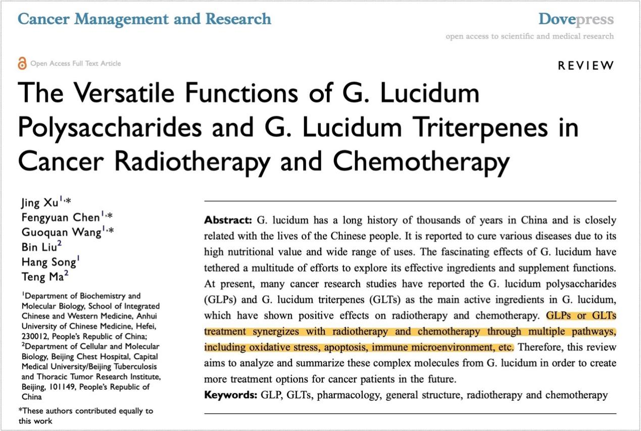 1. Jing Xu, et al. The Versatile Functions of G. Lucidum Polysaccharides and G. Lucidum Triterpenes in Cancer Radiotherapy and Chemotherapy. Cancer Manag Res. 2021;13:6507-6516. doi: 10.2147/CMAR.S319732.