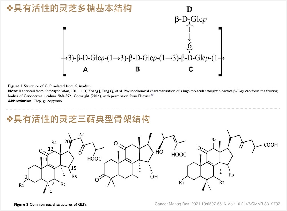 由β-(1→3)-D-葡聚糖主链与β-(1→6)支链构成的灵芝多糖,是灵芝提升免疫功能、发挥抗肿瘤作用的重要成分之一;而由30、27或24个碳原子组成的四环或五环多环萜类骨架,是灵芝三萜化合物的结构核心,这类结构经由不同官能基的修饰,可展现多种药理活性,包括:抗癌、抗发炎与抗病毒等功能。