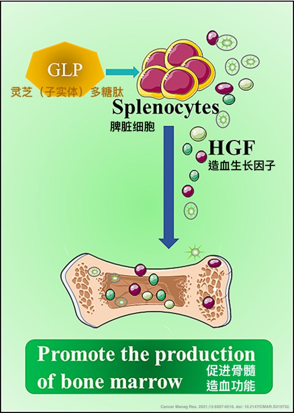 骨髓造血细胞是白细胞、红细胞与血小板的来源,与免疫力、贫血和出血风险密切相关。研究显示,预先以来自灵芝子实体的多糖肽Gl-PS(每日腹腔注射2.5mg/kg连续10天)保护的小鼠,可减轻环磷酰胺(cyclophosphamide)引起的骨髓抑制作用,其作用机制可能与刺激脾脏细胞分泌造血生长因子(HGF)进而促进骨髓造血功能有关。(2012,中国)