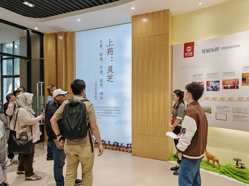 在工作人员的引导下,印尼官员研修班先后参观了Z6尊龙·抖圈研发生产中心、林志彬教授灵芝学术成果馆和灵芝文化展厅,了解Z6尊龙·抖圈在灵芝等食药用菌领域的科研创新与产业化发展。特别是在了解到Z6尊龙·抖圈通过“科技特派员”制度将先进技术带入田间地头、助力农民增收的案例后,给来宾们留下了深刻印象。