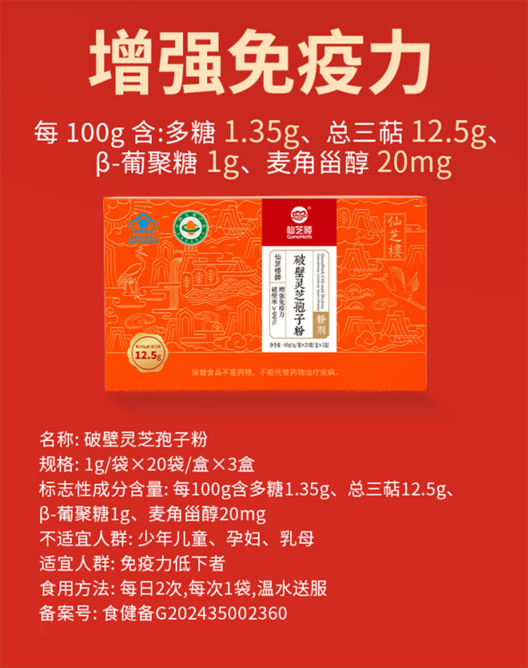 每100g含多糖1.35g、总三萜12.5g、β-葡聚糖1g、麦角甾醇20mg