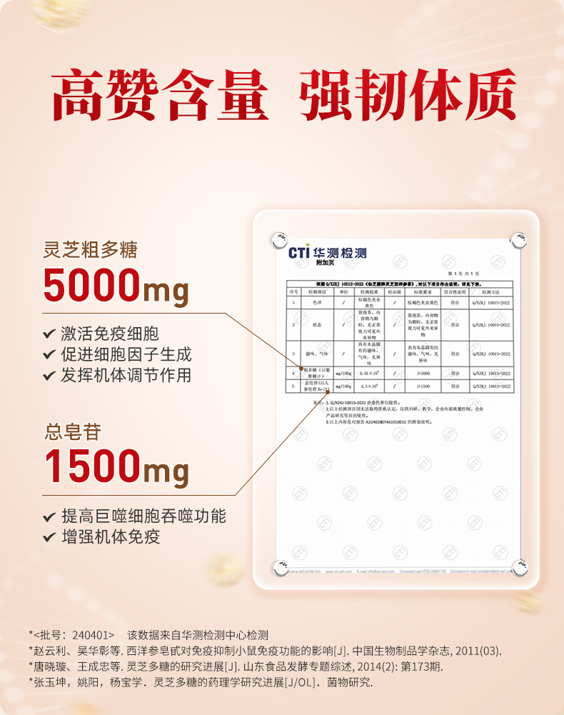 双重提取灵芝子实体精华 配伍破壁孢子粉,给你全部的爱 每100g含粗多糖10g、灵芝总三萜8g
